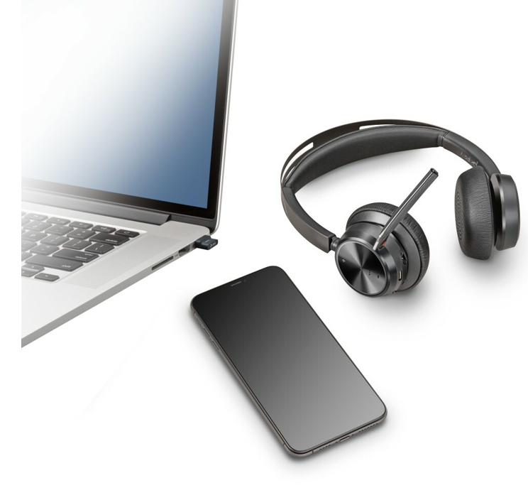 • Voyager Focus 2 Office: PC via USB-A cable, desk phone via included cable; smartphone via Bluetooth. Headset can also connect to PC via included USB cable