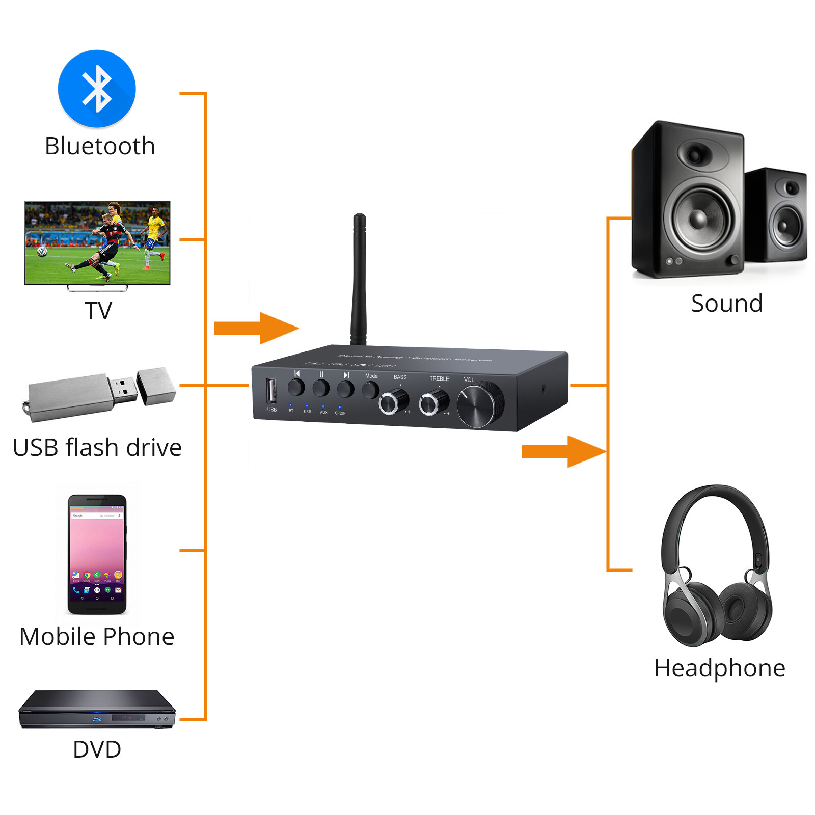 Input: Bluetooth, USB, AUX, Coaxial, Toslink
