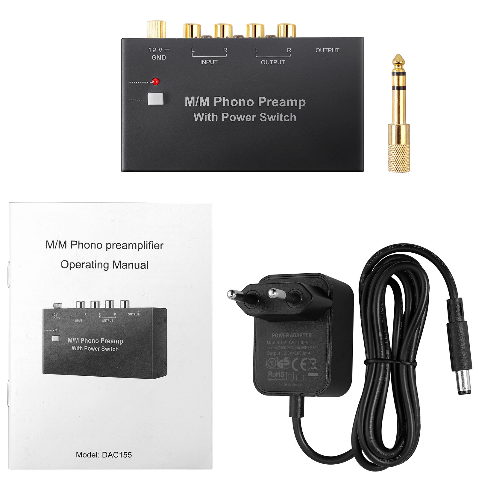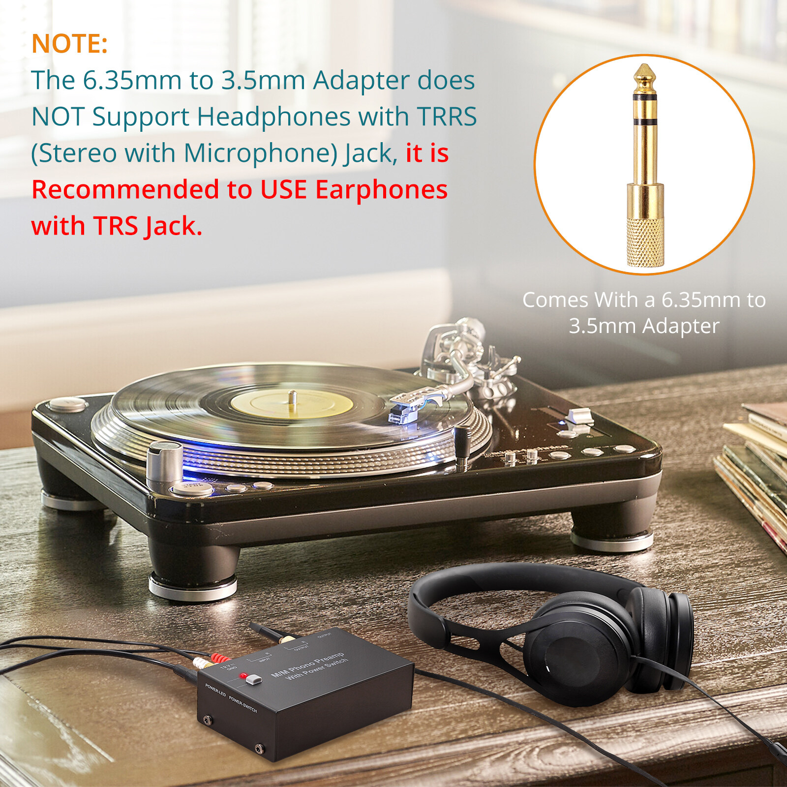 4. The product has left and right channel RCA input and output, and is also equipped with a 1/4'' 6.35mm output interface and a 3.5mm adapter, which is extremely adaptable and can be connected to speakers, computers, laptops, etc. (Note: The adapter does not support TRRS stereo + microphone headphones. This kind of headphones can only hear mono when using them. It is recommended to use only TRS headphones)