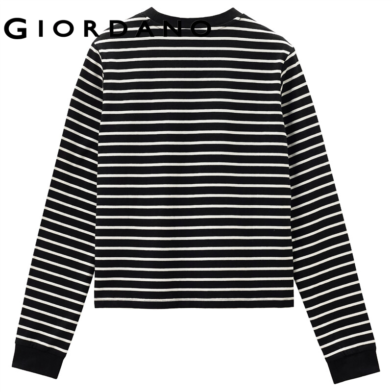 GIORDANO Women T-Shirts Long Sleeve Ribbed Crewneck Casual T-Shirts 100% Cotton Contrast Color Stripe Relaxed Comfy Tee 05322790