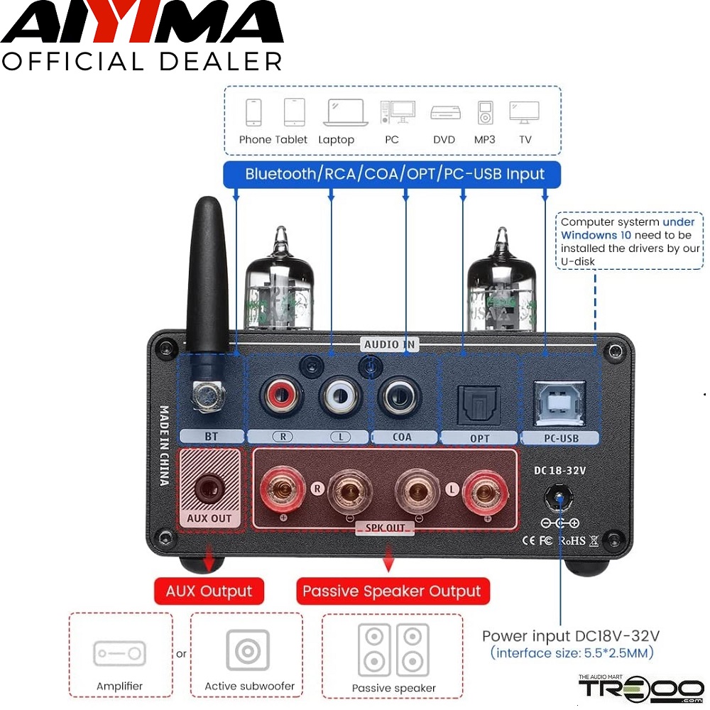 AIYIMA T9 PRO Wireless Bluetooth Receiver/Streamer, Coaxial / Optical / USB DAC & Tube Integrated Amplifier (Official local stock - SG/UK plug)