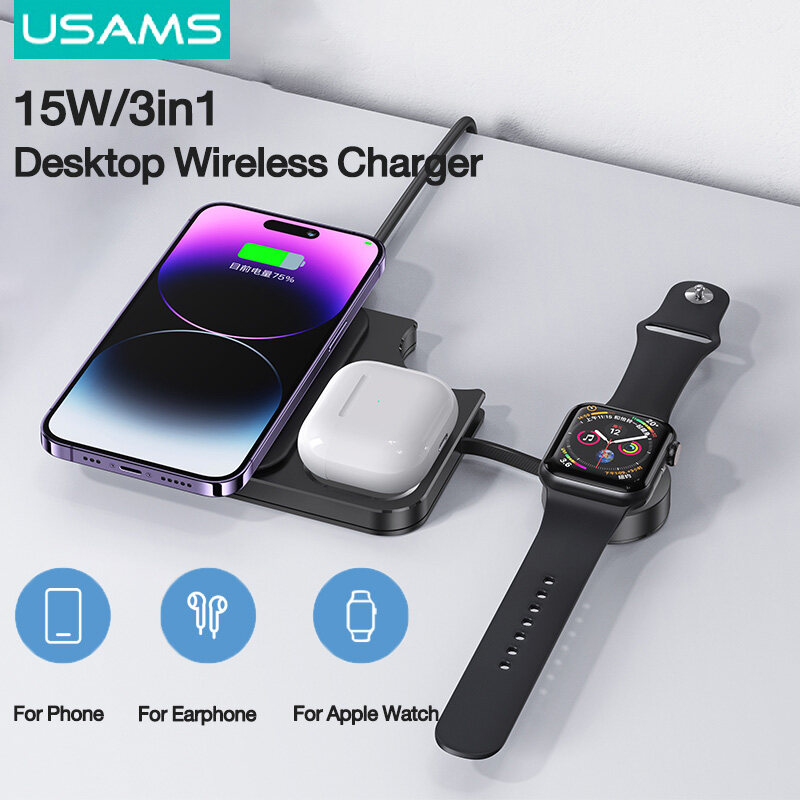 USAMS 15W 3 in 1 Wireless Charger Portable Compact & Lightweight Fast Qi Wireless Charger For Phone 14/13/12 Pro Max/ Mini Fast Charging Pad For Earphone Pro Smart Watch