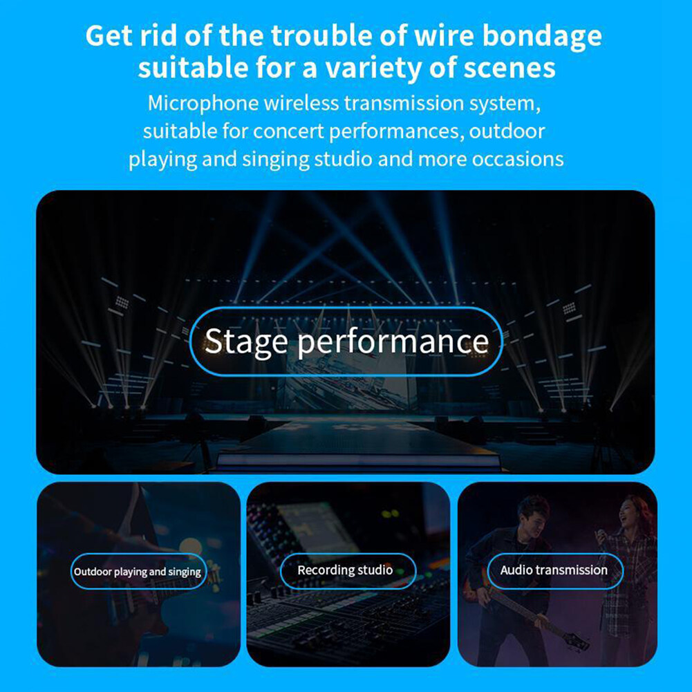 1. Advantages and Scenarios: The microphone wireless transceiver solves the wireless audio signal transmission between the microphone and the audio, the mixer, and the sound card, realizing the expansion effect of wireless audio transmission, and solving the traditional wiring mode. This product is suitable for stage performances, outdoor entertainment, speeches, outdoor performances, and other places