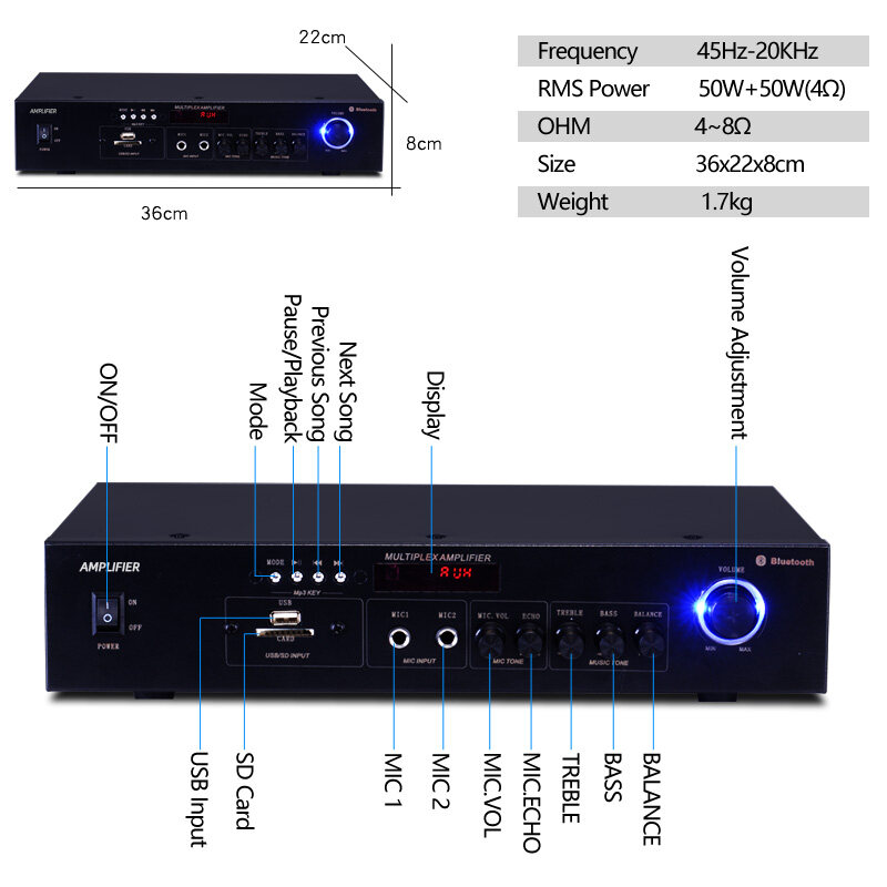 Speaker is wooden material. 2-Channel power amplifier (50W+50W). Amplifier can only be used with 220V~240V 50Hz/60Hz AC power supply.