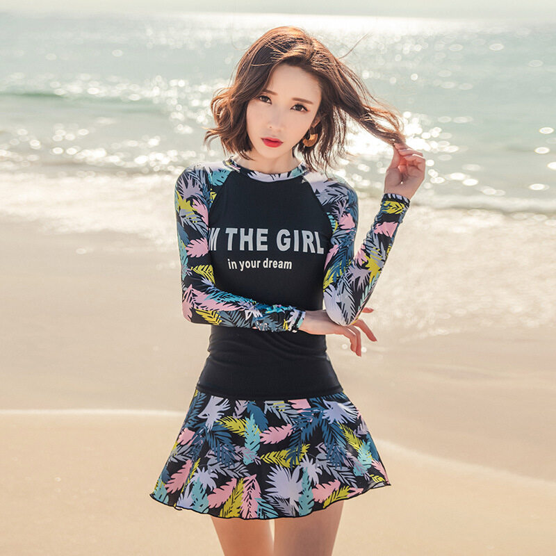 Luoke Letter Floral Print Women Fashion Long Sleeve Two Pieces Suits Sun-resistant Swimsuit swimming suit