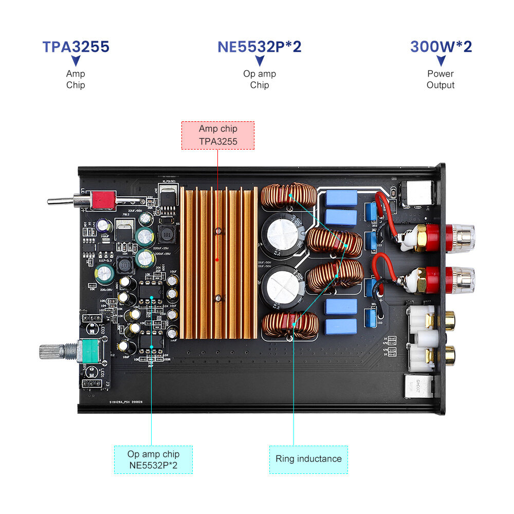 Texas Instruments TPA3255, digital audio amplifier BTL bridge power output 300W * 2 channel design, THD less than 0.03% when working continuously